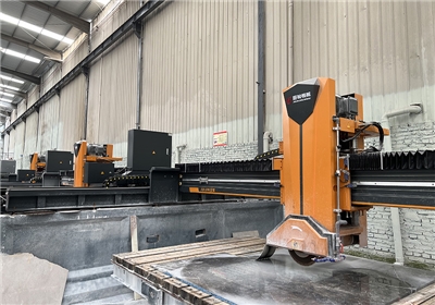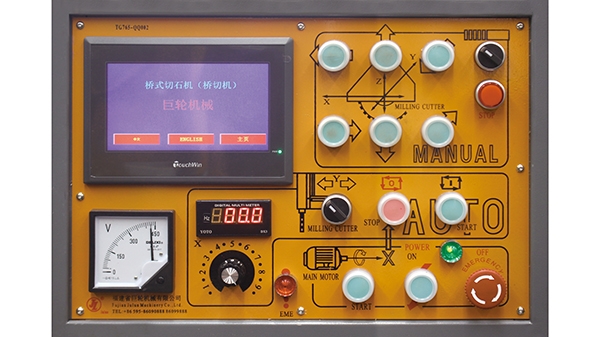 該機(jī)采用 PLC 可編程系統(tǒng)和人機(jī)操作界面,輔以高精度旋轉(zhuǎn)編碼器定位及紅外標(biāo)線儀。左右走刀采用變頻器控制,加上結(jié)構(gòu)優(yōu)化升級(jí),左右走刀速度可大大提升,提高產(chǎn)能;上下升降采用液壓升降,結(jié)合厚鍍鉻導(dǎo)柱+耐磨導(dǎo)套,配合間隙小,耐磨精準(zhǔn);主軸箱配套優(yōu)化升級(jí),可兼容高轉(zhuǎn)速;關(guān)鍵部位均采用進(jìn)口零配件,因而具有切割效率高、切割精度高、穩(wěn)定性高、操作簡便等優(yōu)點(diǎn),特別適用于花崗巖、大理石、巖板等板材的切割。